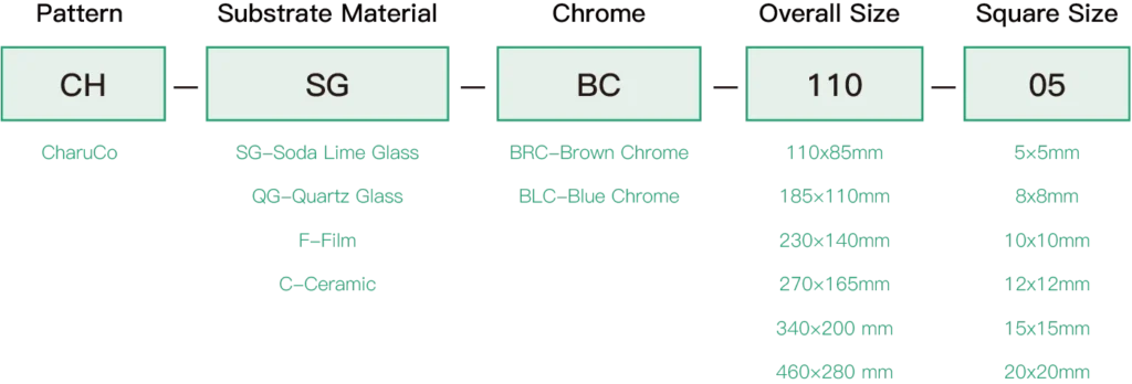 | CH-QGBLC-230-10 | Quartz Glass | Blue Chrome | Backlight | 230×140 | 10×10 | 5x5 | 0 | 16 x 9 | ±0.5µm | ||